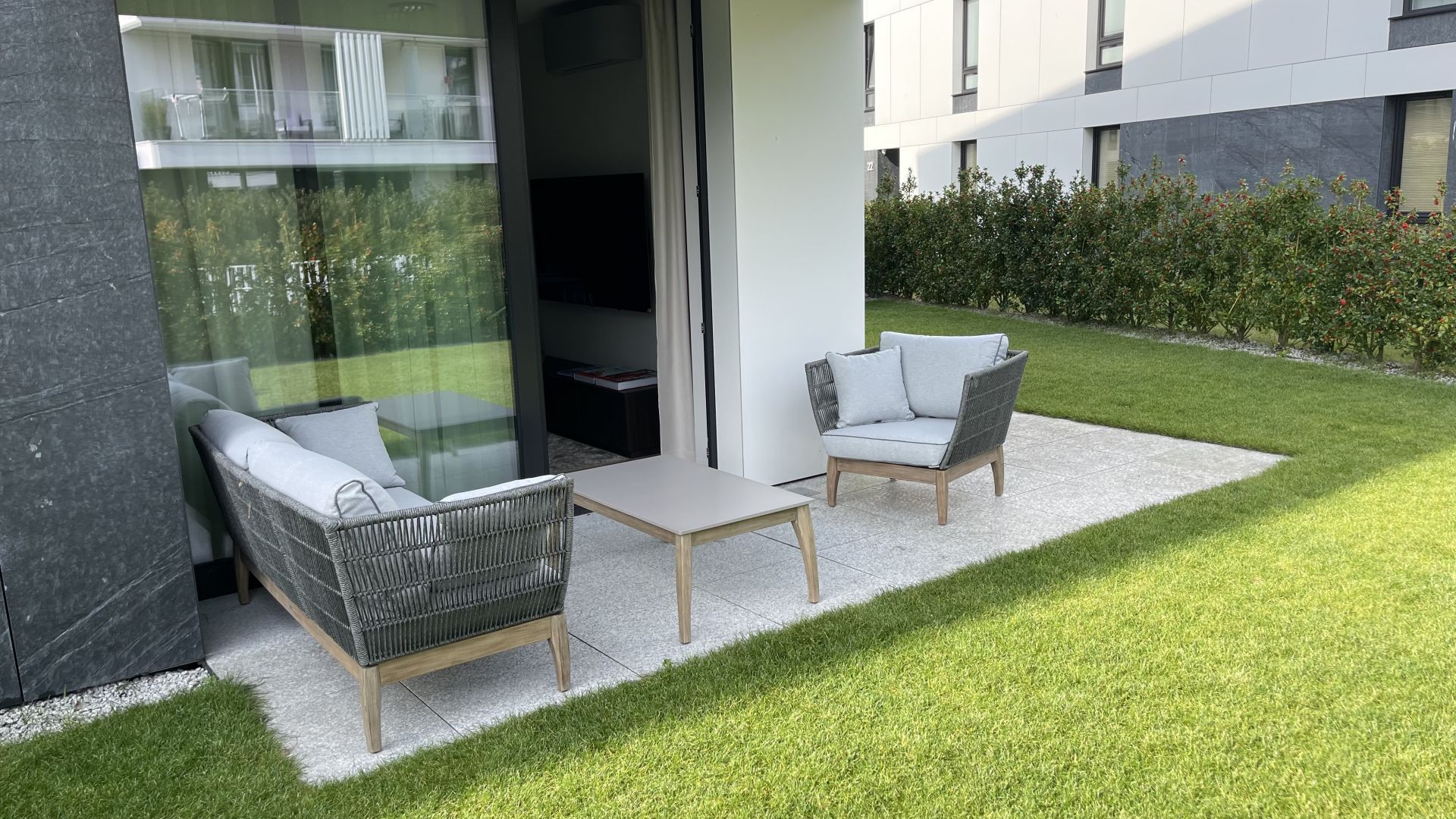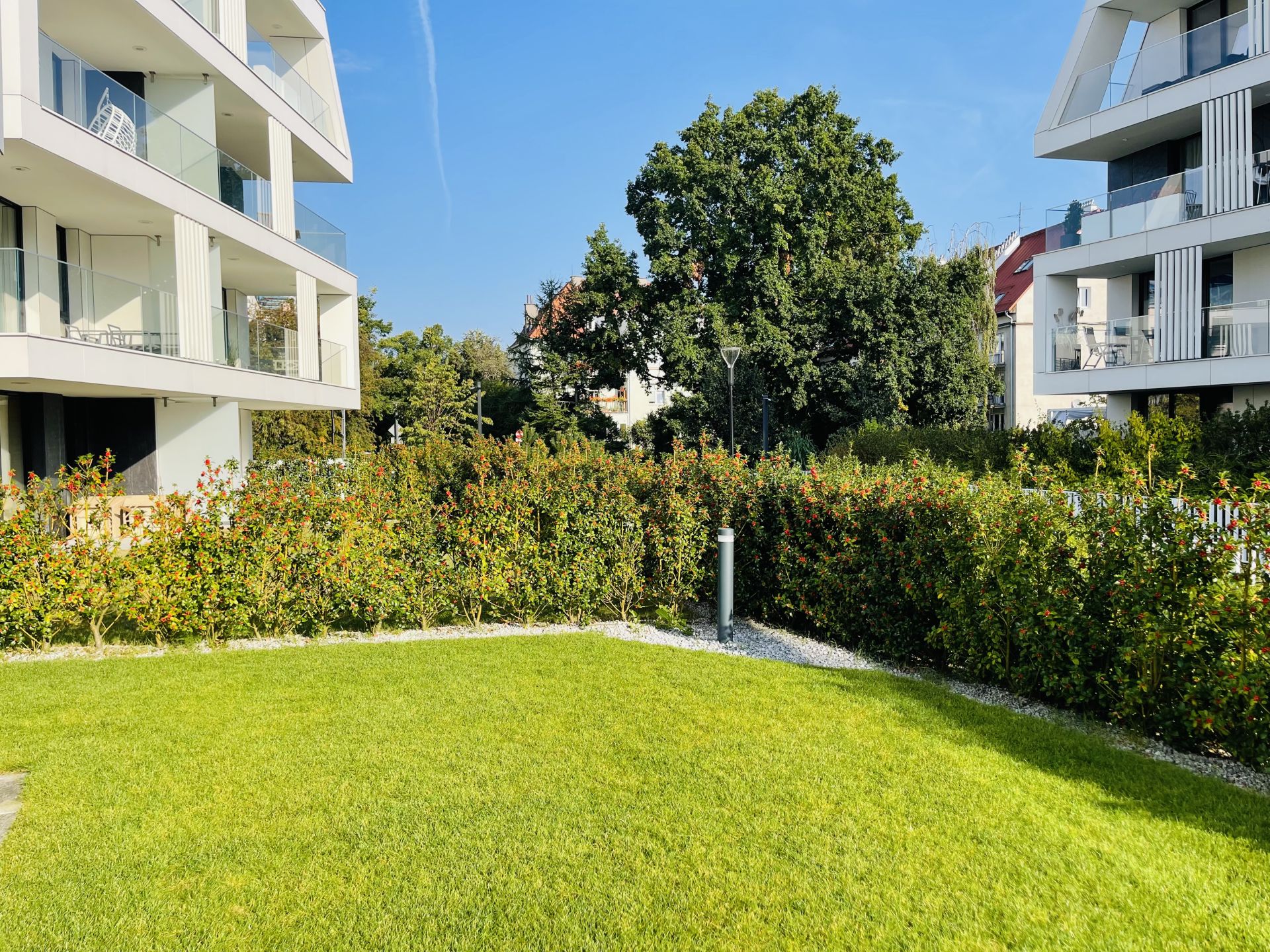 Apartament Azyl położony jest na prestiżowym osiedlu „Okrzei” w Sopocie. Ta wyjątkowa lokalizacja zapewnia wynajmującym komfort i bezpieczeństwo. Mieszkanie zlokalizowane jest na parterze kameralnego budynku i dysponuje 100-metrowym prywatnym ogrodem z wygodnymi meblami. Sam apartament jest starannie zaprojektowany i wykonany z najwyższej jakości materiałów. Składa się z klimatyzowanego salonu z aneksem kuchennym, sypialni oraz łazienki. Goście mogą korzystać z prywatnego miejsca parkingowego w hali garażowej pod budynkiem.