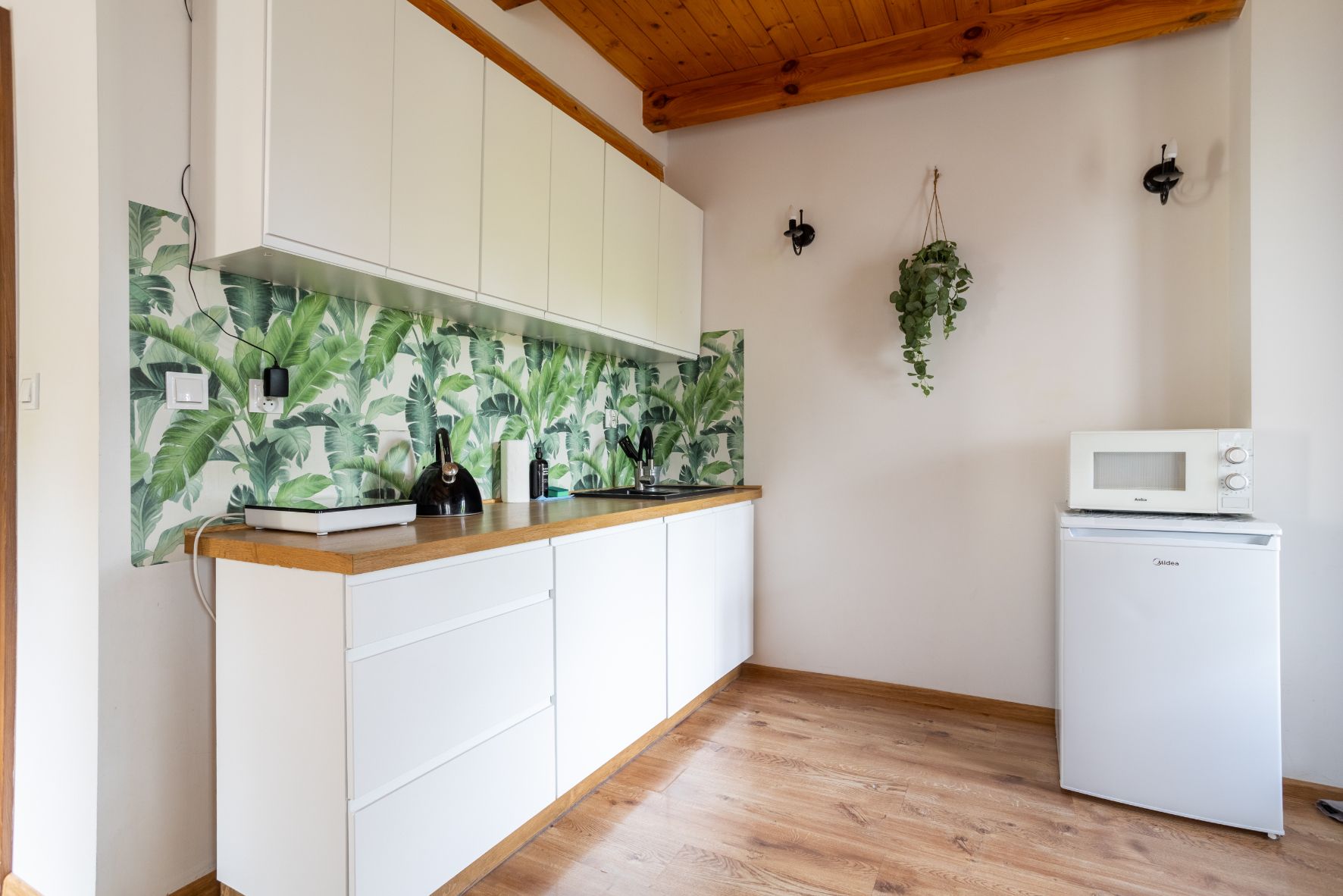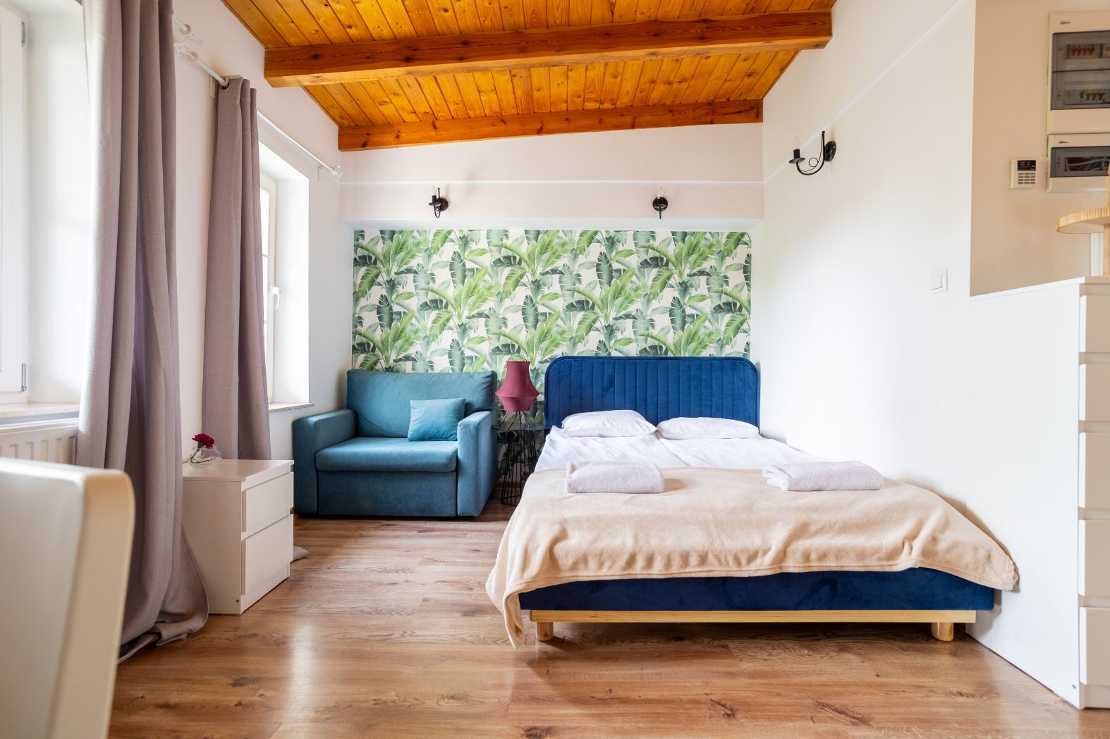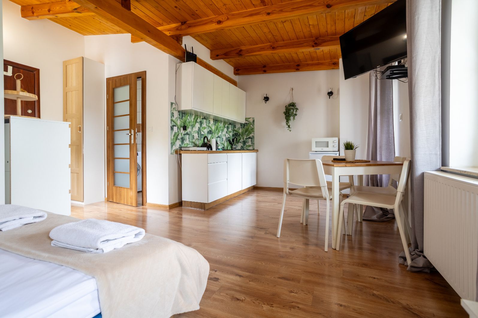 W apartamencie znajduje się wygodne łóżko podwójne, rozkładany fotel do spania dla jednej osoby, aneks kuchenny z pełnym wyposażeniem, a także łazienka z wanną – idealna na relaks po całym dniu. Dodatkowym atutem jest balkon, który pozwala cieszyć się świeżym powietrzem i spokojem okolicy.